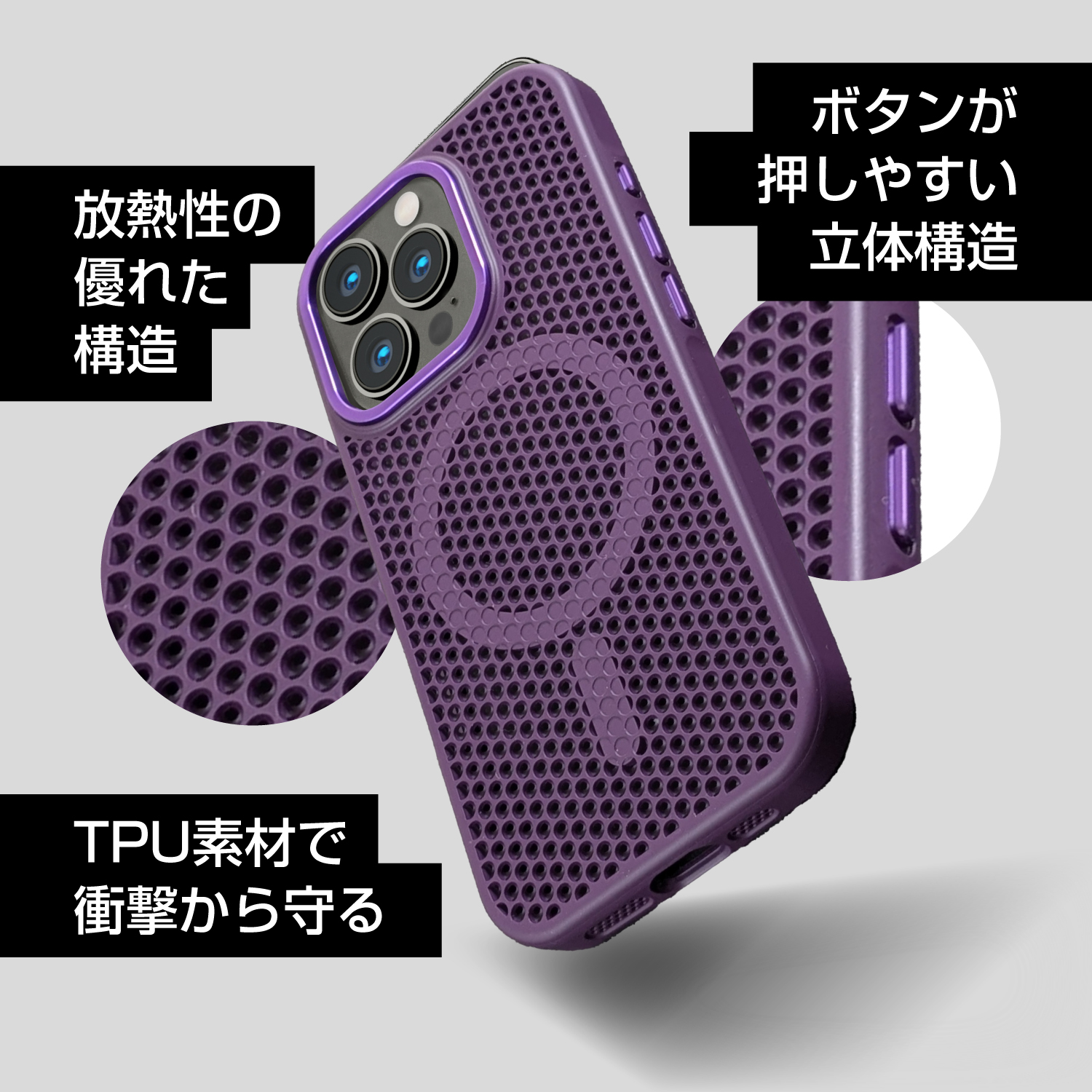 【TPU素材】ケース全体のホール形状により放熱性に優れ、手汗を軽減し丈夫な構造により衝撃を和らげます。ケース全体の凹凸でしっかりとしたグリップを実現し心地よい手触りが特徴です。