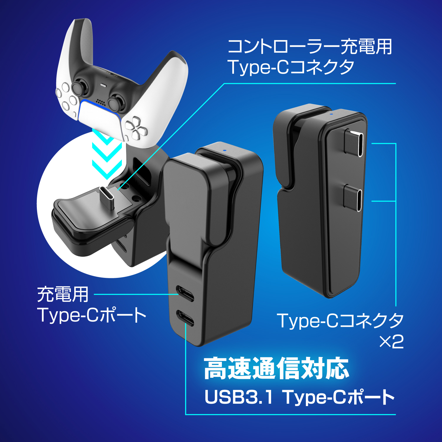 【多機能充電】PS5コントローラー用の充電ポートとデータ転送ポートを備えた充電スタンドです。TYPE-Cポートで簡単に接続でき、コントローラーの充電中には赤色ランプが点灯し、充電完了時には青色ランプが点灯します。