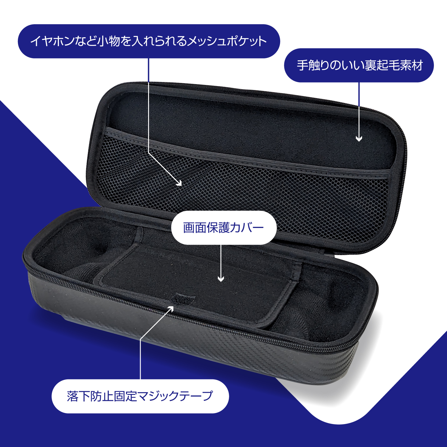 【本体をしっかり守る】本製品は、衝撃に強いEVA素材を使用しております。内部は裏毛仕様となっており、柔らかくゲーム機本体を優しく包み込みます。ゲーム機本体を固定するバンドも付いているため安心です。