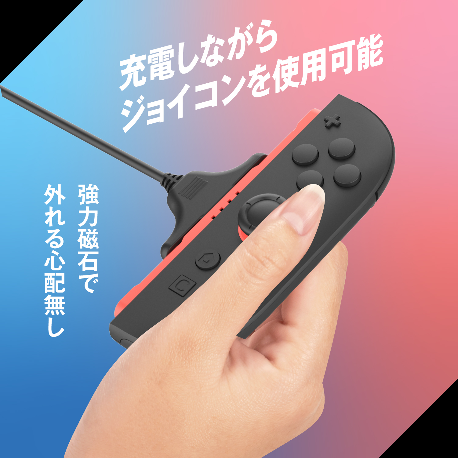 【簡単接続&はずれにくい】Joy-Conの差し込み口に充電ケーブルをはめるだけの簡単接続。両サイドに強力な磁石が付いているため、より一層はずれにくい仕様になっています。