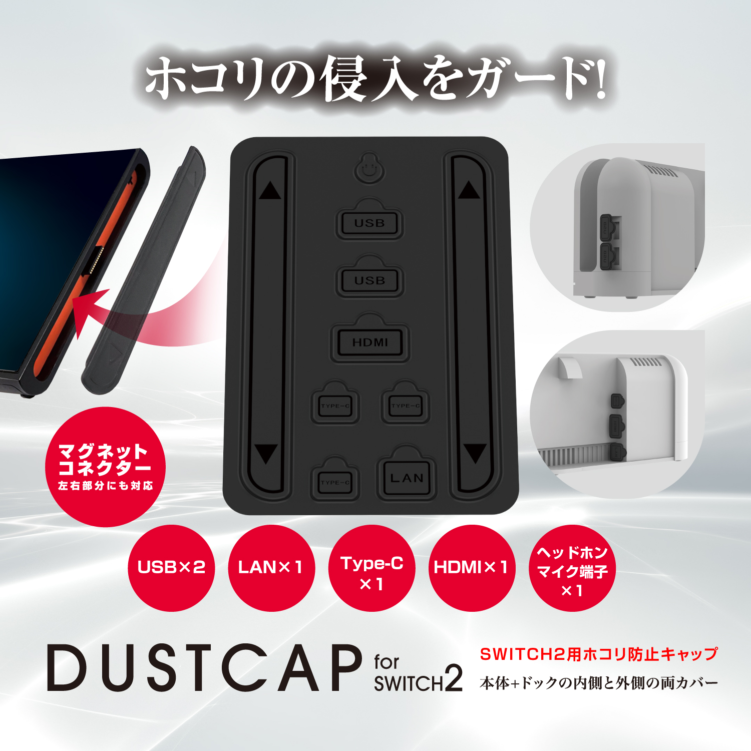 【対応機種】Switch2対応のホコリ防止キャップです。ドックの端子差し込み口や本体のマグネットコネクターに、細かなゴミやホコリ、湿気などが入るのを防止してくれるアイテムです。