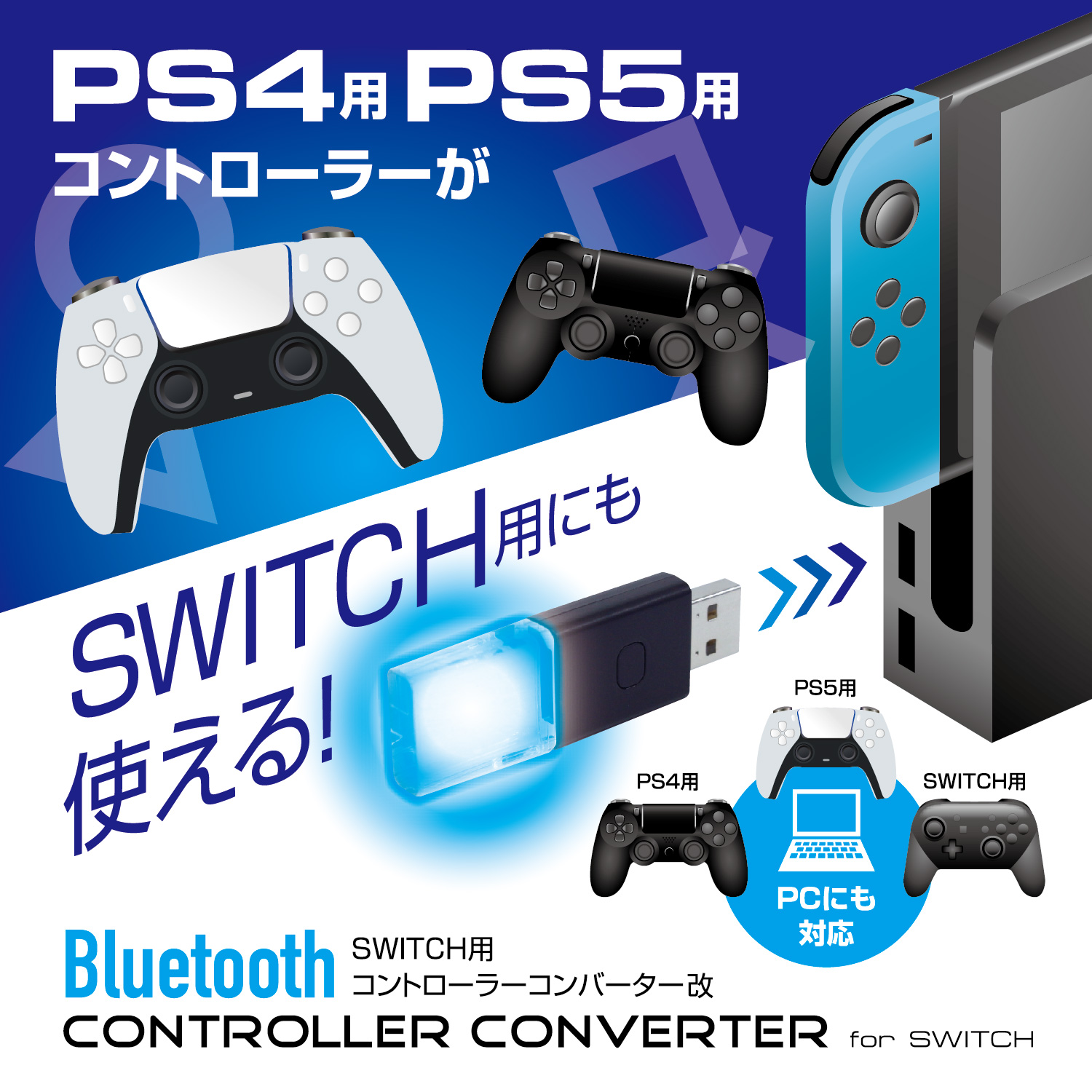 【お気に入りのコントローラーが使える】本製品はSWITCH、PCに接続することにより、PS5、PS4、プロコンのコントローラーが使えるようになるコンバーターです。使い慣れたコントローラーで、より快適にプレイを楽しむことができます。