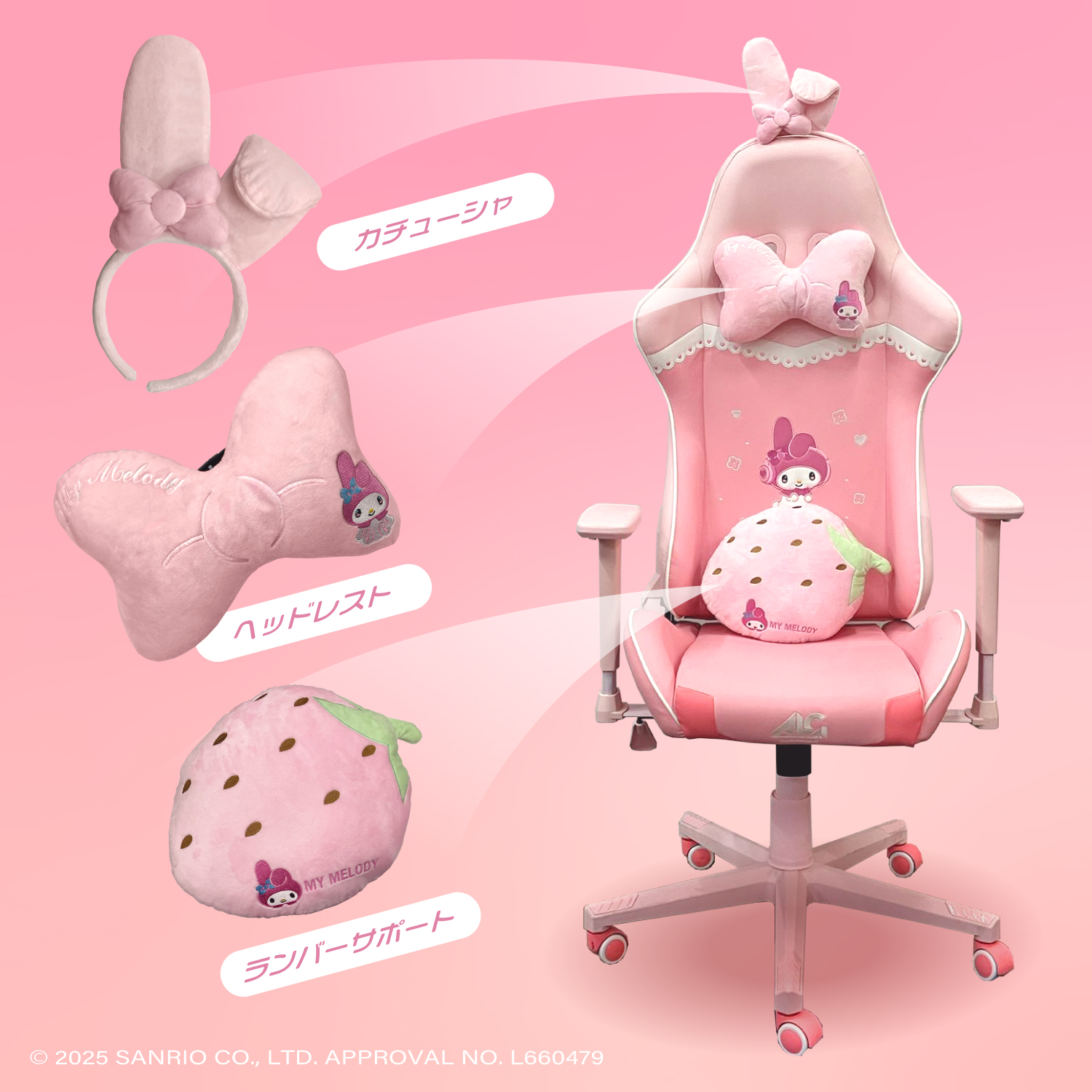 【すべてがマイメロディ仕様!】サンリオキャラクターズ「マイメロディ」をイメージしたゲーミングチェアです。 カラーリングから刺繍まで、すべてマイメロディ仕様となっております。