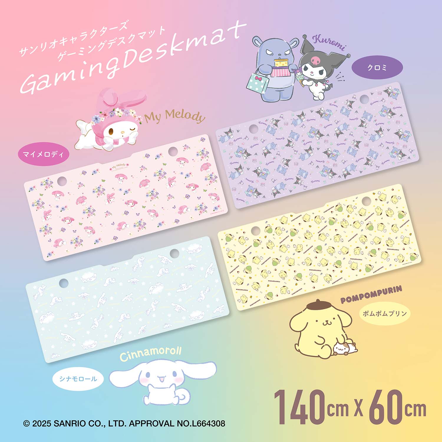 ALLONE製電動昇降式デスク140cm専用の、かわいいサンリオキャラクターズのデスクマットです。